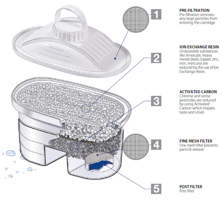 Cartusele Bi-Flux filtreaza apa in 5 etape:
